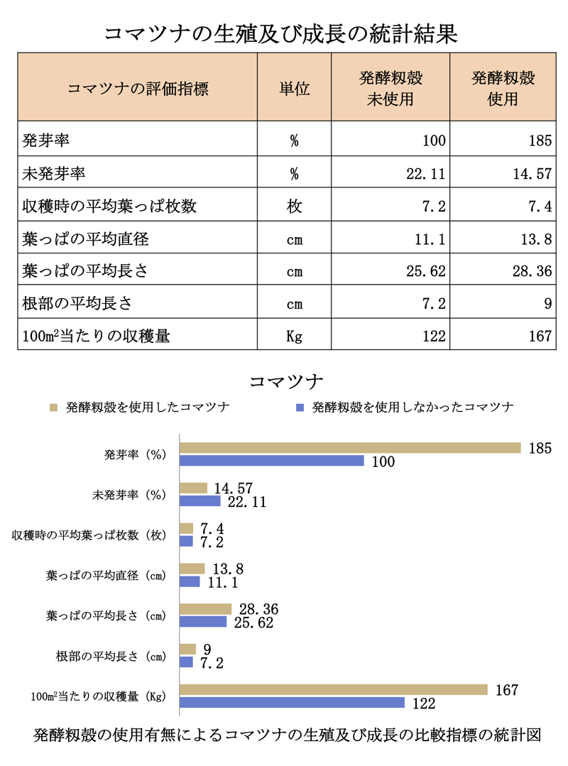 A-左:発酵もみ殻未使用のコマツナ●●●B-左:発酵もみ殻未使用のコマツナの根部