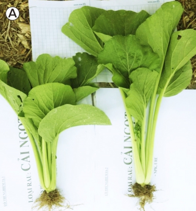 ●●A-右:発酵もみ殻を使用したコマツナ●●B-右:発酵もみ殻を使用したのコマツナの根部