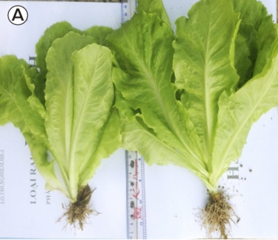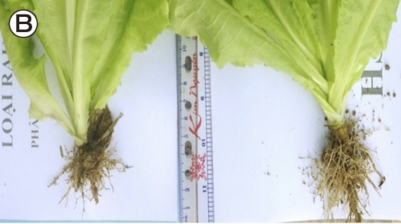 ●●A-右:発酵もみ殻を使用したレタス●●B-右:発酵もみ殻を使用したのレタスの根部