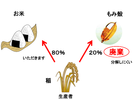 これまで生産者は、稲からお米ともみ殻に分けた後、もみ殻は分解しづらいものとして廃棄していました。